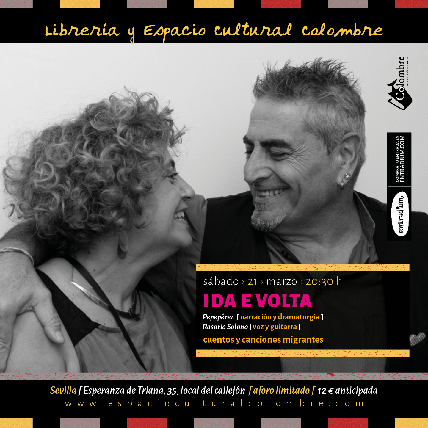 INTERVIENEN: Pepepérez [narración y dramaturgia] y Rosario Solanos [voz y guitarra] SINOPSIS: «En este espectáculo donde la voz se acompaña del canto, las historias y canciones van y vienen de un lugar a otro, de una lengua a otra, pero con una sola memoria: la memoria de los que se van y sueñan con el regreso. Atravesando las fronteras con nuestros vecinos, transitaremos por los caminos del recuerdo, que palpita al ritmo de las palabras.