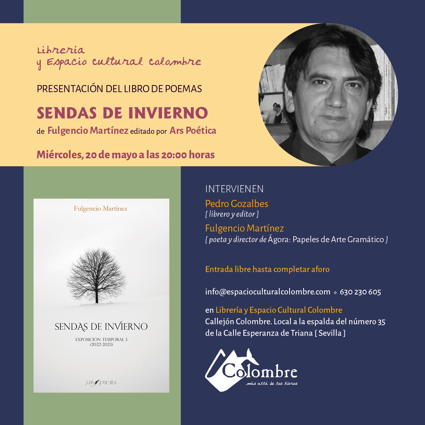 Espacio Cultural Colombre C/ Esperanza de Triana, 35. Local lateral, SevillaFECHA: Miércoles, 20 de mayo de 2026 HORA: 19:30 h ACTIVIDAD: Presentación del libro Sendas de invierno de Fulgencio Martínez publicado por Ediciones Ars Poética CATEGORÍA: Poesía INTERVIENEN: Pedro Gozalbes