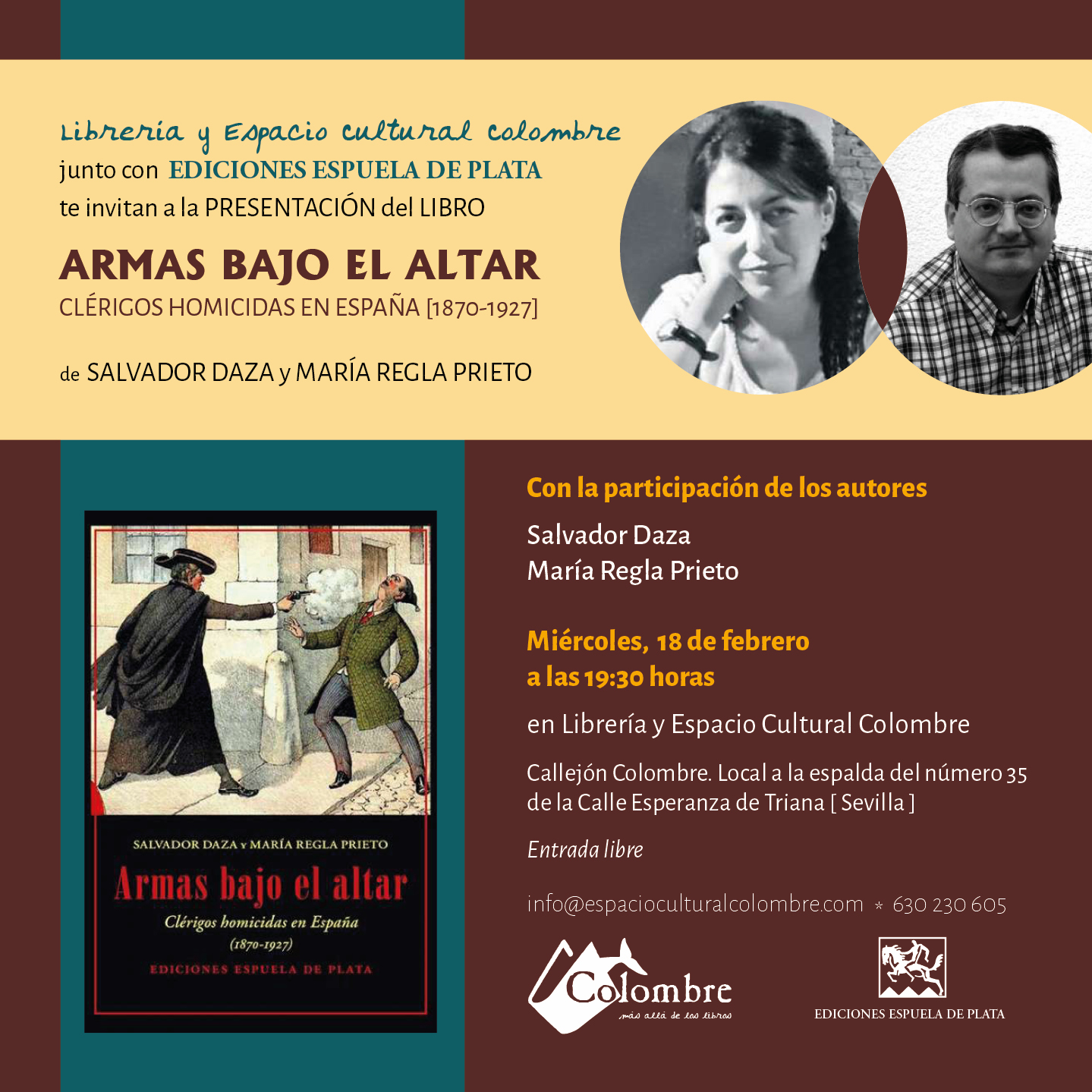 FECHA: Miércoles, 18 de febrero de 2026 HORA: 19:00 h ACTIVIDAD: Presentación del libro Armas bajo el altar (Espuela de Plata, 2025) CATEGORÍA: Historias / Libros / Divulgación INTERVIENEN: Salvador Daza Palacios y María Regla Prieto SINOPSIS: En esta sexta entrega de la ya consolidada serie de investigación histórica sobre Clérigos homicidas en España, Salvador