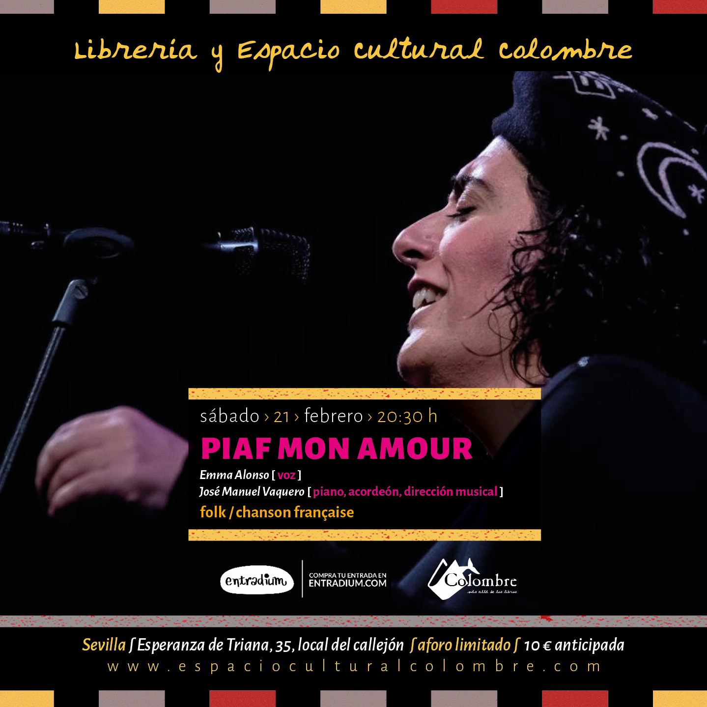 FECHA: Sábado, 21 de febrero de 2026 HORA: 20:30 h TÍTULO DE LA ACTIVIDAD: Chanson Française. Piaf, mon amour CATEGORÍA:Música en directo/ Concierto / Chanson François / Folk INTERVIENE: Emma Alonso (voz); José M. Vaquero (piano, acordeón, dirección musical) SINOPSIS: La chanson nos brinda canciones llenas de fuerza, belleza y emoción. Sus creadores, la mayor
