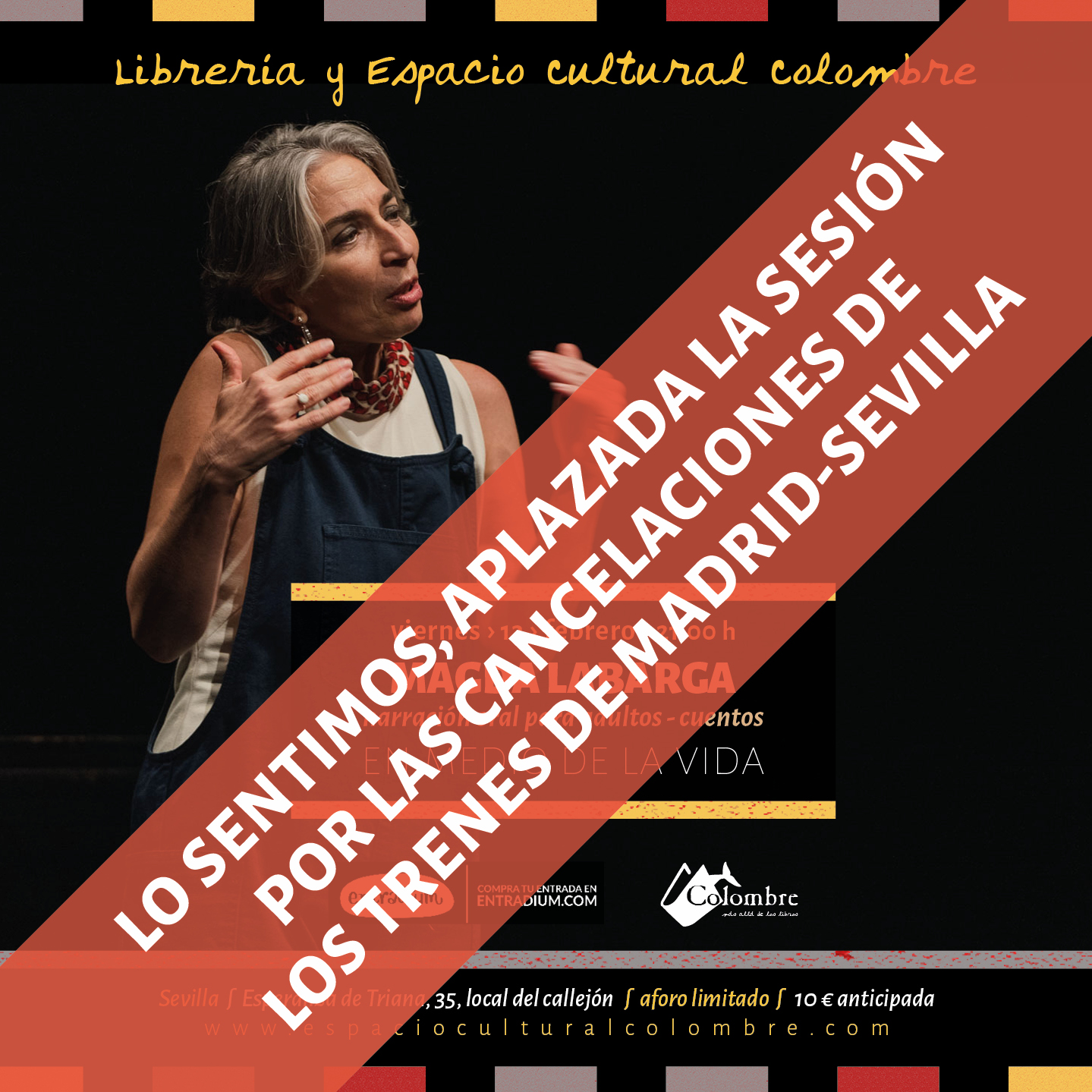 FECHA: Viernes, 13 de febrero de 2026 (CANCELADO) HORA: 21:00 h TÍTULO DE LA ACTIVIDAD: En medio de la vida CATEGORÍA: Narración Oral / Historias / Cuentos INTERVIENE: Magda Labarga SINOPSIS: «Puedo imaginarme sin hacer muchas cosas, pero no sin contar cuentos: cuando cuento estoy en medio de la vida. Cuento para celebrar la maravillosa
